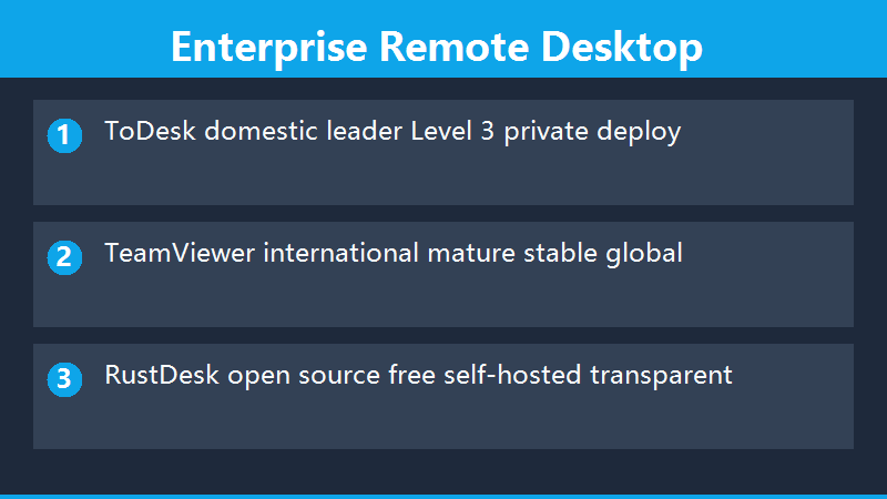 中小企业50人以下:推荐ToDesk企业版或RustDesk,成本可控部署简单。中大型企业50到500人:推荐ToDesk企业版私有化部署配合管理后台,或考虑微软RDS实现VDI。大型企业500人以上:建议评估ToDesk企业版私有化部署或Windows RDS方案,金融医疗等合规要求高的行业必须私有化部署。部署要点:每个并发会话预留5到10Mbps带宽,启用双因素认证和设备访问白名单,配置全量操作审计日志,采用负载均衡确保高可用。参考远程桌面软件速度实测对比了解性能表现。